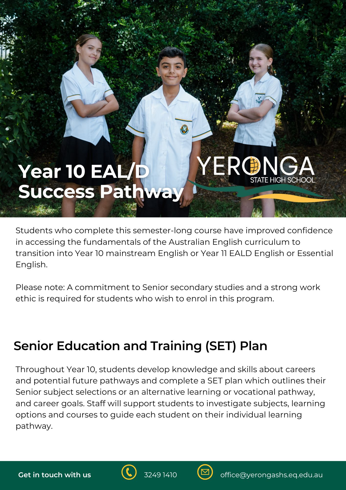 - Yeronga SHS delivers the General subject English as an Additional Language. This enables students to access University through an English subject with a greater focus on grammar